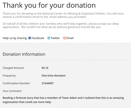 After doing some research into Team Adam, I came to find that it is a real team attached to the National Center for Missing & Exploited Children (NCMEC) and I gave a small $5 donation to their cause.